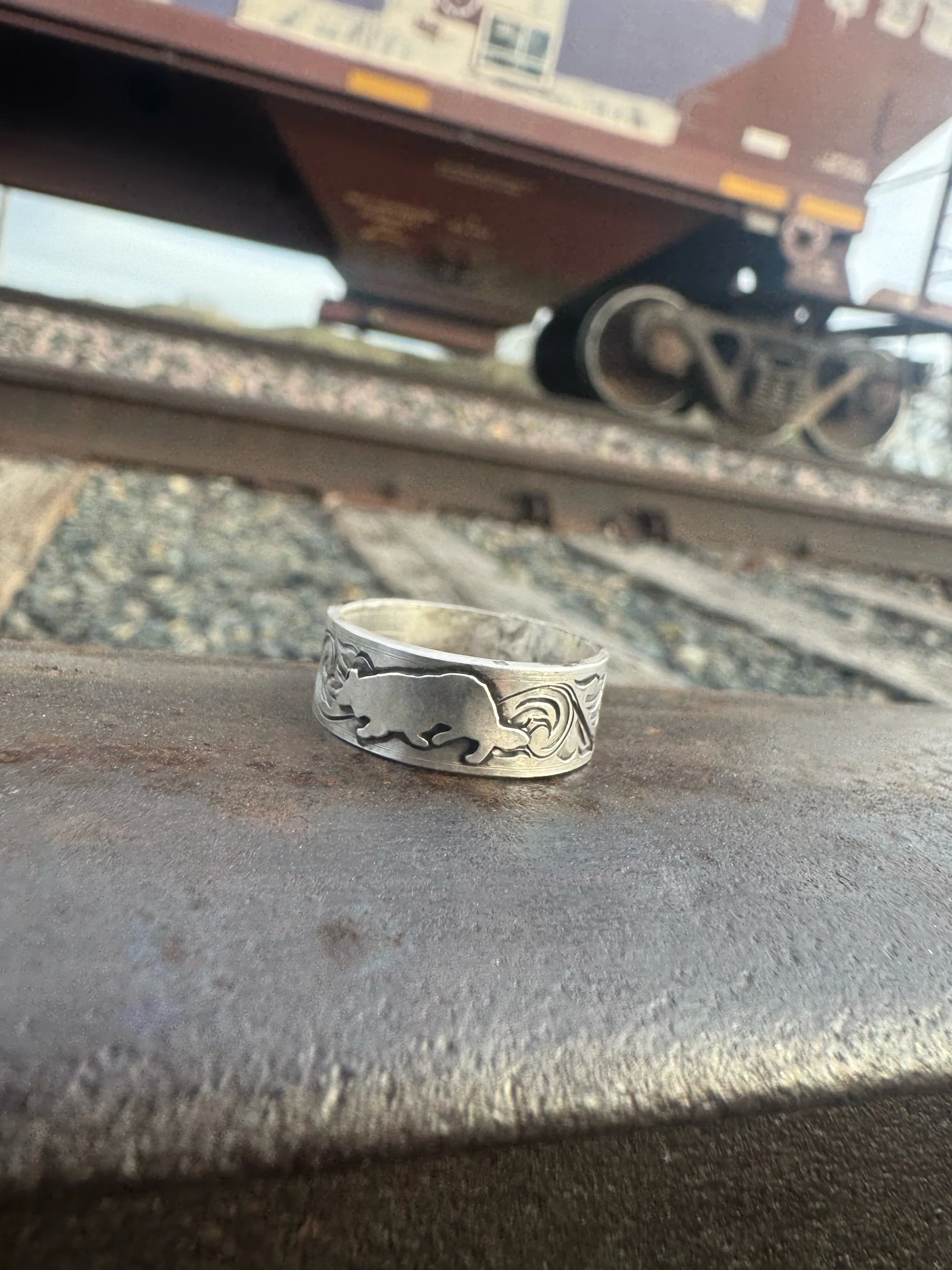 Old Soul Silver Co › Man’s best friend, engraved ring Image 1 of 1 Man’s best friend, engraved ring $200.00 Size 10Heavy gauge hand engraved western bright cut Purchase Added! Size 10Heavy gauge hand engraved western bright cut